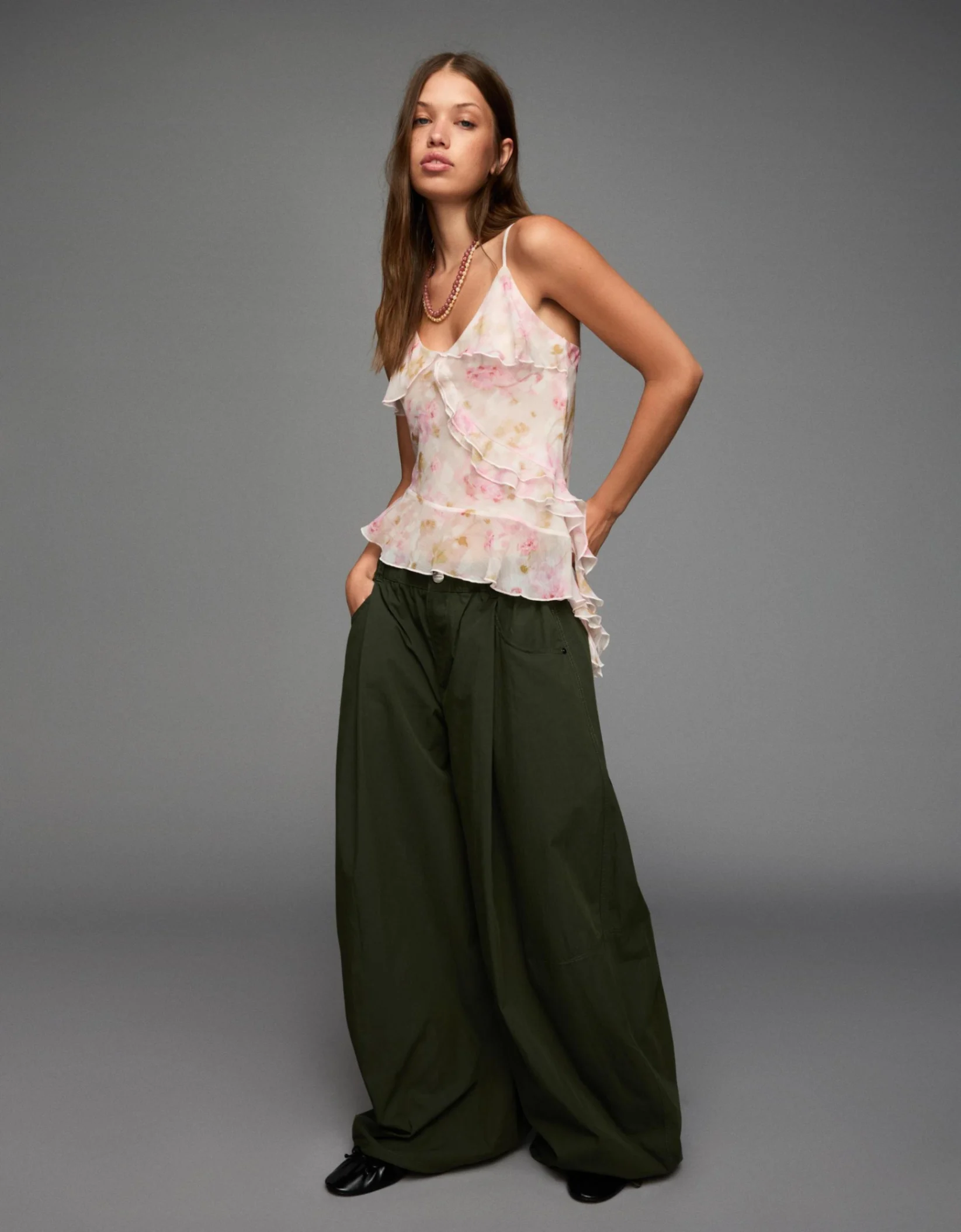 Feminine, airy, and effortlessly charming, this ruffled tank top is a must-have for warm-weather days or layered looks. Crafted from lightweight, breathable fabric, it drapes softly over the body for a comfortable yet flattering fit. Delicate ruffle detailing along the neckline and straps adds a playful, romantic touch that elevates even the simplest outfit. Perfect for pairing with high-waisted jeans, flowy skirts, or tailored shorts, it transitions seamlessly from a casual day out to an evening gathering.